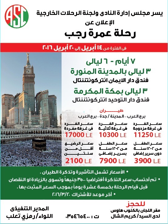 يسر مجلس إدارة النادي ولجنة الرحلات الخارجية الإعلان عن رحلة عمرة رجب في الفترة من ١٤ إبريل
